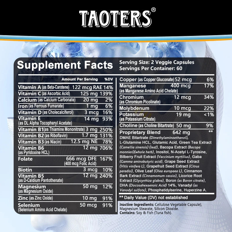 Boost your brain power with our Multivitamin & Nootropic Brain Support Supplement. Packed with essential vitamins, minerals, and brain-boosting ingredients like zinc and folic acid, it enhances memory, concentration, and mental clarity. Perfect for seniors looking to improve cognitive function and stay sharp throughout the day.
